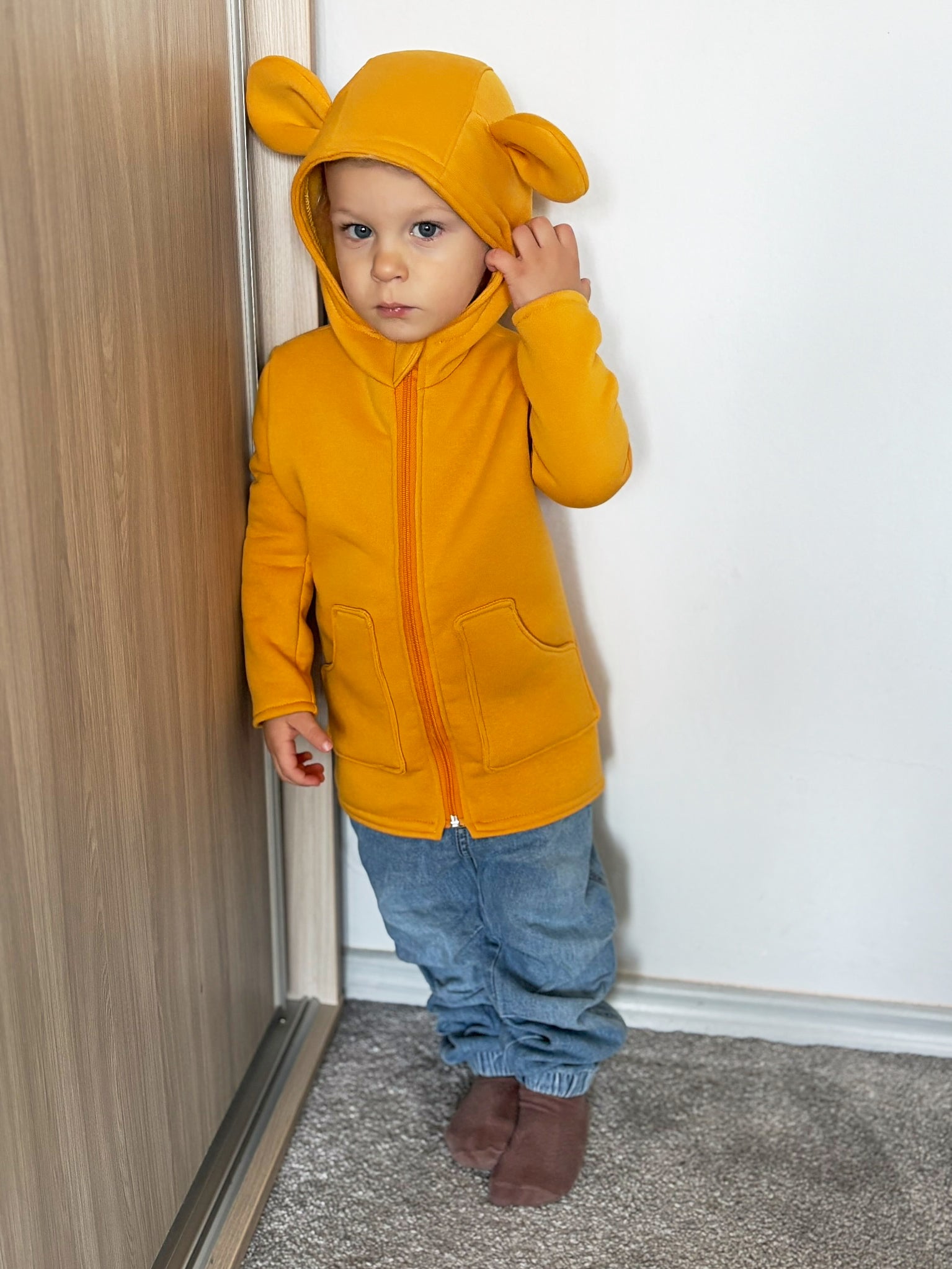 Roztomilý mikino‑kabátek s oušky, ve kterém se děti promění v malé medvídky. Střih je navržen pro šití z počesané teplákoviny a je ideální do chladnějších dnů. Zadní díl je prodloužený do elegantního „fraku“, který střihu dodává originální a hravý vzhled.